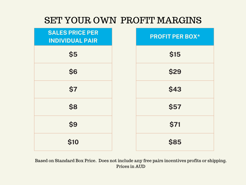 See profit chart below on our fundraiser boxes - 14 pairs per box.
